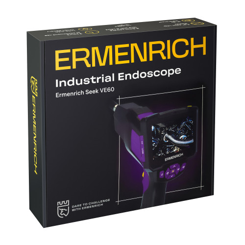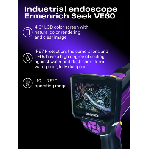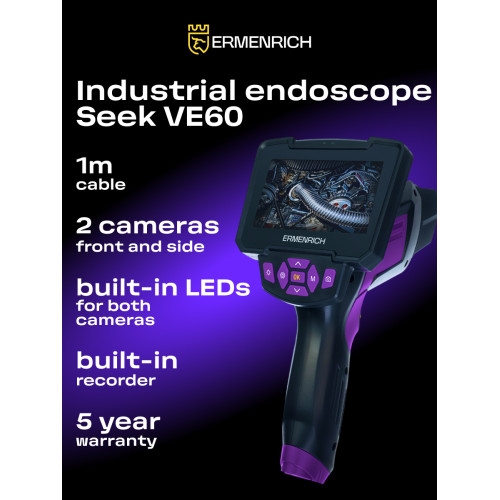 Устройство для осмотра трудноступных мест трубопроводов, кабельных линий, промышленного оборудования. Бороскоп Ermenrich Seek VE60 оснащен полужестким кабелем длиной 1 м и цветным дисплеем с диагональю 4,3. У этой модели две камеры ndash одна фронтальная и одна боковая ndash для съемки фото (разрешение 1280x720 пикс) и видео (640x480 пикс). Камера имеет угол обзора 70deg и дает четкое изображение благодаря светодиодной подсветке. Степень герметичности камеры IP67, ее можно погружать в воду.