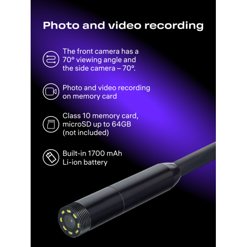 Емкость встроенного аккумулятора 1700 мАч, этого достаточно для 3 часов автономной работы. Зарядное устройство не входит в комплект поставки. К эндоскопу прилагаются 3 насадки: крюк, магнит и защитный колпачок.