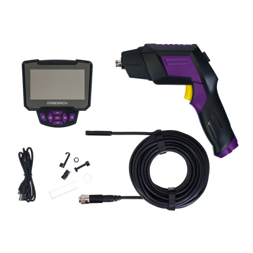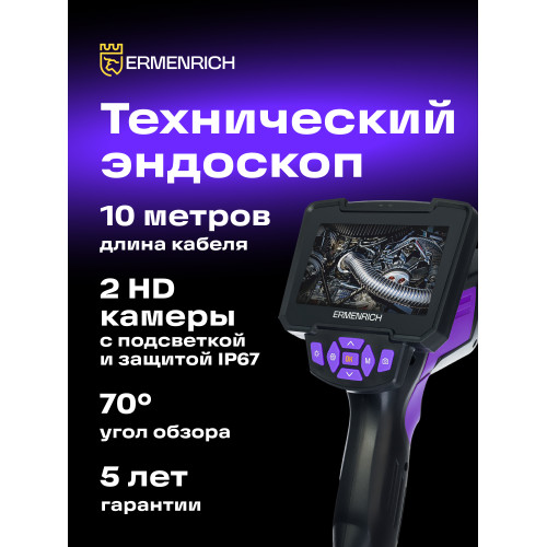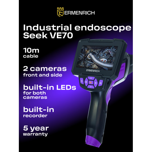 Бороскоп Ermenrich Seek VE70 с полужестким кабелем длиной 10 м и с двумя камерами высокого разрешения ndash фронтальной диаметром 8 мм и боковой диаметром 4,5 мм. Тонкий кабель длиной 10 м можно быстро завести в труднодоступное место, например, при ремонте трубопровода или автомобильного двигателя. Обе камеры имеют светодиодную подсветку, угол обзора составляет 70deg. Степень защиты камер и ламп подсветки IP67, поэтому их можно использовать даже под водой (в течение небольшого времени).