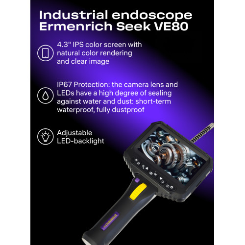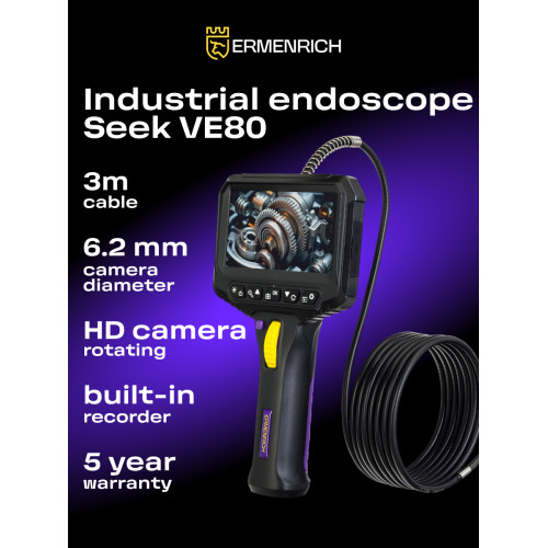 Видеоэндоскоп Ermenrich Seek VE80 был создан для облегчения контроля качества строительства и монтажа коммуникаций (труб, вентиляционных шахт, дымоходов, электропроводки и т. д.), особенно в труднодоступных и темных местах, застенных пространствах и полостях. Исследование интересующей области проводится при помощи специального зонда, состоящего из кабеля длиной 3 метра и 1 поворотной камеры, расположенной на его конце.