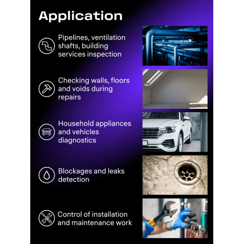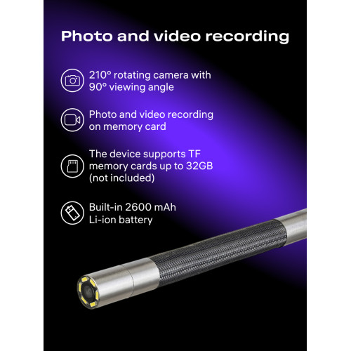Камера обеспечивает широкий обзор с углом 90° и помогает изучать зоны, в которые не проникает свет, за счет 6 ярких светодиодов. Наконечник зонда, т. е. камера, диоды и пластиковая оболочка вместе, имеет диаметр 6,2 мм – идеальный размер, чтобы без труда проникнуть в нужное пространство через совсем небольшое отверстие, не требующее разрушения стены или демонтажа отделки. Поворот камеры возможен на 210° по часовой стрелке и против часовой стрелки, осуществляется вращением колеса на рукоятке прибора.