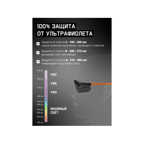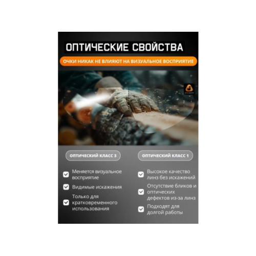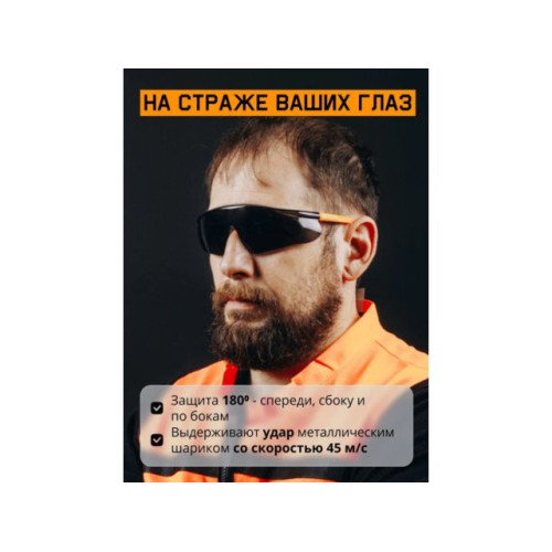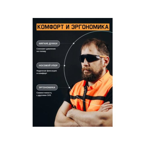 Очки эргономичны и конструктивно совместимы с различными видами СИЗ. Мягкие вставки на заушниках снижают давление на голову, а мягкий носовой упор делает продолжительную работу не только более комфортной, но и надежной (благодаря крепкой фиксации очков на лице). Дымчатые линзы снижают утомляемость глаз в условиях избыточной освещенности, прекрасно подходят для работы на ярком солнце. Литая конструкция минимизирует вероятность поломки. Защитные свойства 1FT: 1 — оптический класс, F — низкоэнергетический удар (45 м/c), Т — механическая защита при экстремальных температурах, N — водостойкость и устойчивость к запотеванию.,