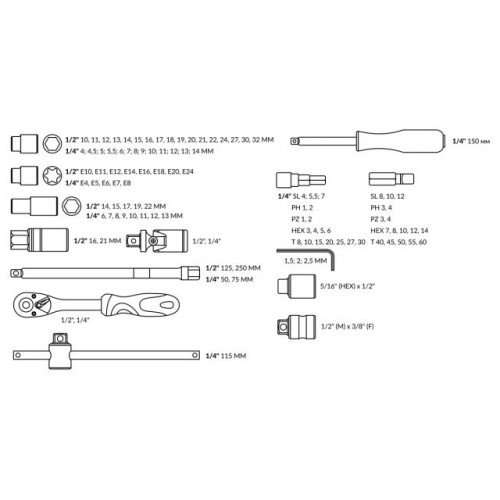 Торцевые головки 1/2" - 17 предметов: (10, 11, 12, 13, 14, 15, 16, 17, 18, 19, 20, 21, 22, 24, 27, 30, 32мм)