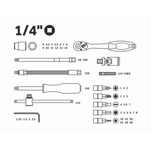 Назначение: многофункциональный набор предназначен для ремонта и обслуживания автомобиля, а также для выполнения других слесарных работ,