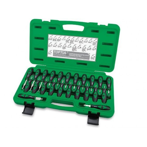 Набор универсального инструмента TOPTUL состоит из 23 предметов и предназначен для извлечения клемм из пластиковых соединительных колодок. Все инструменты изготовлены из высокопрочных материалов, удобны в использовании и спроектированы таким образом, чтобы не повреждать провода, клеммы и соединительные колодки. Набор применим к большинству типов автомобильных клеммных соединений. Набор упакован в ударопрочный пластиковый кейс размером 435х250х75 мм. Рекомендуется для профессионального использования.