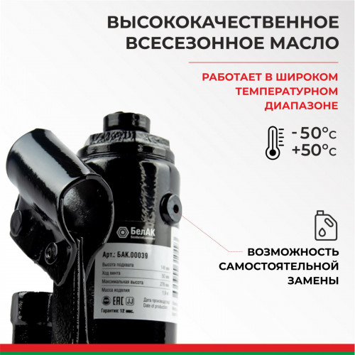 Бутылочный гидравлический домкрат, произведенный из высококачественных компонентов, адаптирован для эксплуатации в интенсивном режиме. Стальной корпус, защищённый трёхслойным ЛКП, обладает гарантированной устойчивостью к механическим воздействиям и атмосферным факторам. Компактный гидравлический домкрат укомплектован высококачественными резиновыми уплотнителями, обеспечивающими полную герметичность гидросистемы устройства. Серьёзным конкурентным преимуществом домкратов «БелАК» является исключительная мобильность. Домкраты нашего производства имеют компактные размеры и на 10-15% легче аналогов других производителей. Это достигается за счёт применения более прочных и дорогих марок стали при производстве домкратов «БелАК». В результате домкрат удобнее хранить и транспортировать без ущерба его потребительским характеристикам. Данное изделие оборудовано дополнительным предохранительным клапаном, предотвращающим поломку при случайной перегрузке домкрата.