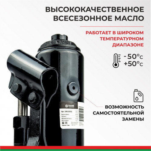 Домкрат БелАК 5 т БАК.00042 разработан российским производителем «БелАК», награждённым двумя национальными премиями «Автокомпонент года» и «Автоаксессуар года» за высокое качество и надежность выпускаемых домкратов. Продукция «БелАК» соответствуют нормам сертификации ISO9001 и ЕАС.