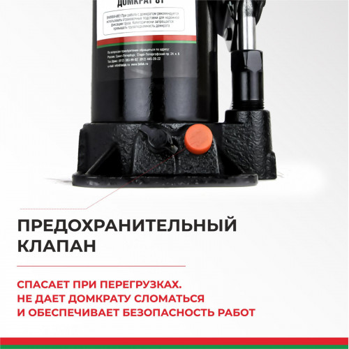 Бутылочный гидравлический домкрат, произведенный из высококачественных компонентов, адаптирован для эксплуатации в интенсивном режиме. Стальной корпус, защищённый трёхслойным ЛКП, обладает гарантированной устойчивостью к механическим воздействиям и атмосферным факторам. Компактный гидравлический домкрат укомплектован высококачественными резиновыми уплотнителями, обеспечивающими полную герметичность гидросистемы устройства. Серьёзным конкурентным преимуществом домкратов «БелАК» является исключительная мобильность. Домкраты нашего производства имеют компактные размеры и на 10-15% легче аналогов других производителей. Это достигается за счёт применения более прочных и дорогих марок стали при производстве домкратов «БелАК». В результате домкрат удобнее хранить и транспортировать без ущерба его потребительским характеристикам. Данное изделие оборудовано дополнительным предохранительным клапаном, предотвращающим поломку при случайной перегрузке домкрата.
