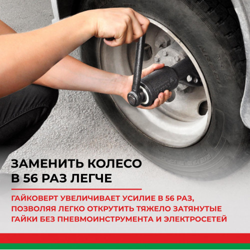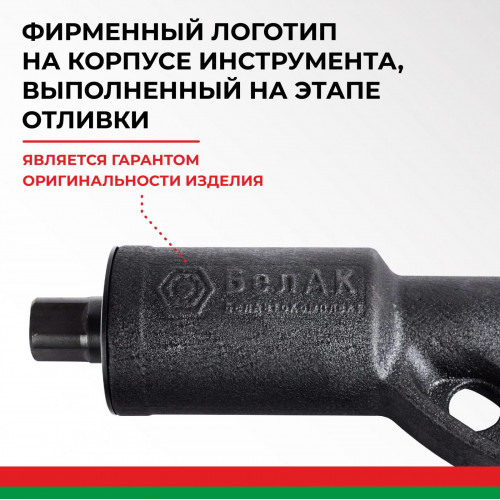 Механический гайковерт 32х33 БелАК БАК.00017 с набором головок обладает светоотражающим пыльником, который защищает от попадания грязевых частиц в механизм редуктора гайковерта. Фирменный логотип на корпусе, выполненный на этапе отливки, защищает от подделок и является гарантом оригинальности изделия. Индивидуальная упаковка головок (индивидуальный пакет + крышка с логотипом) защищает их от коррозии. Передаточное число: 1:56, то есть приложенное усилие будет увеличено в 56 раз. В механизме редуктора гайковерта использованы подшипники, а не втулки скольжения, как у аналогов. Все головки для гайковертов «БелАК» являются ударными.