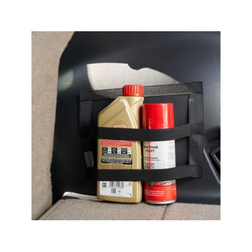 Карман надежно прикрепляется к ворсовому покрытию багажника при помощи липучки и предназначен для фиксации различного рода предметов, таких как огнетушители малых объемов, баллоны с автохимией, браслеты противоскольжения, аптечки, перчатки, салфетки и т. п.