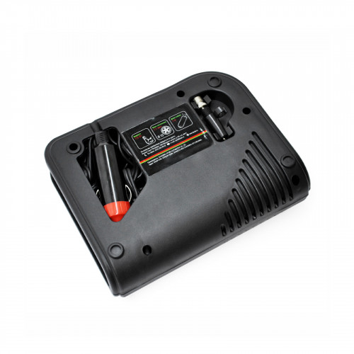 Присоединяется к прикуривателю. В комплекте: 2 сменные насадки для шланга накачки, подробная инструкция на русском языке.