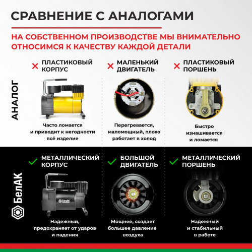 Автомобильный компрессор "Новичок-20" БАК.99150 разработан российским производителем «БелАК», награждённым девятью национальными премиями «Автокомпонент года» за высокое качество выпускаемой продукции. Компрессоры «БелАК» соответствуют нормам сертификации ISO9001 и ЕАС.