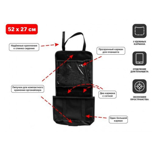 Органайзер выполнен из водонипраницаемого материала и имеет множество карманов, в том числе, и для планшета, чтобы ваш ребенок не скучал в дороге.