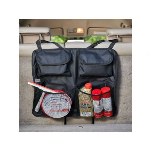 Органайзер на спинку заднего сиденья применяется для компактного размещения различных аксессуаров в багажнике автомобиля. Крепится за подголовники спинки заднего сиденья. Закрывает 2/3 площади спинки сиденья. Имеет 4 вместительных кармана.