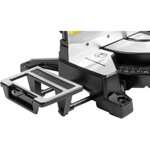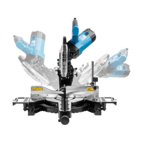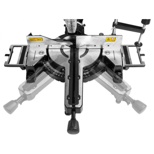 Торцовочная пила имеет функцию наклона пильной головы как влево, так и вправо, в диапазоне от 0 до 45. Кроме того, регулируется и нижнее основание влево и вправо, в диапазоне от 0 до 45. Так же есть функция быстрой фиксации нижнего поворотного стола под углами в: 0, 22.5, 31.6, 45, как влево, так и вправо.