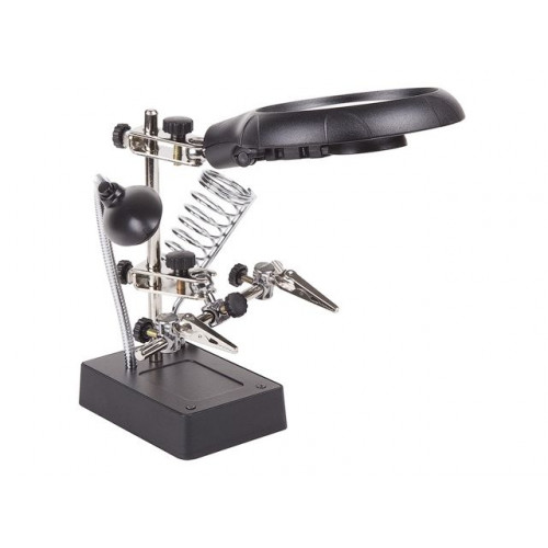 Держатель <третья рука> с лупой х2.5 + х7.5, подставка под паяльник, LED подсветка служит главным образом при проведении паяльно-сборочных работ в электронике, ювелирном деле, сборке и ремонте для зажима мелких деталей в любом нужном положении, когда не хватает двух рук.