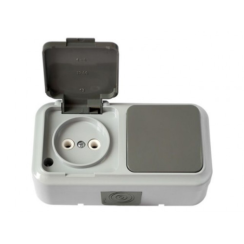 Блок выкл. 1 клав. + розетка (открытая, б/з, брызг. защ.) серая, Пралеска Аква, Bylectrica
