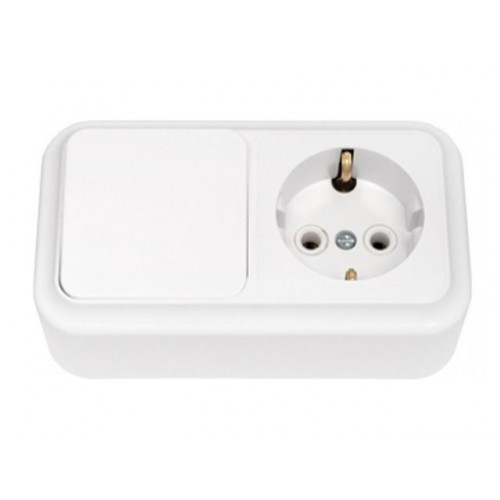 Блок выкл. 1 клав. + розетка (открытая, с/з) белая, Пралеска, BYLECTRICA