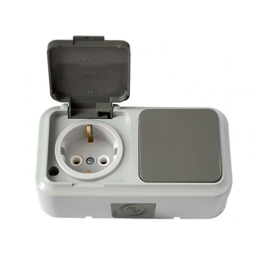 Блок выкл. 1 клав. + розетка (открытая, с/з, брызг. защ.) серая, Пралеска Аква, Bylectrica