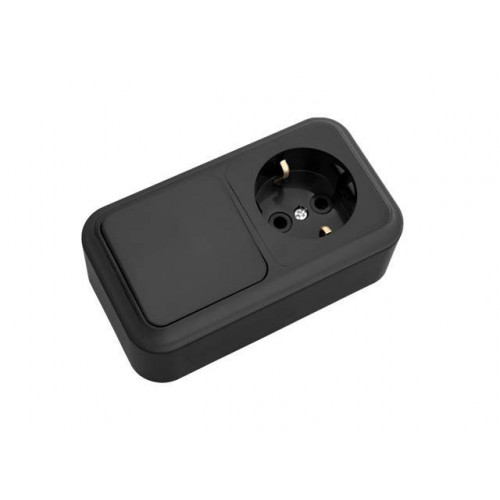 Блок выкл. 1 клав. + розетка (открытая, с/з) черный, Пралеска, BYLECTRICA