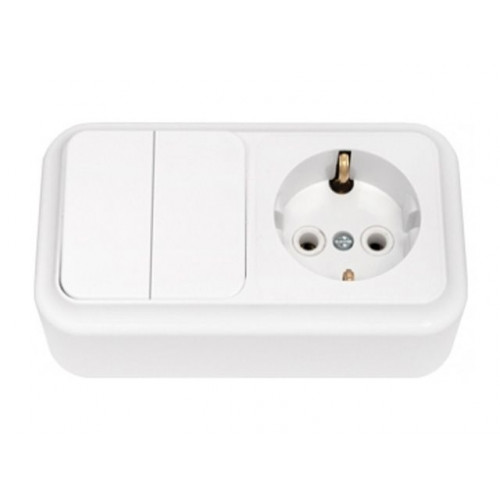 Блок выкл. 2 клав. + розетка (открытая, с/з) белая, Пралеска, BYLECTRICA