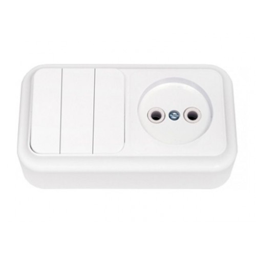 Блок выкл. 3 клав. + розетка (открытая, б/з) белая, Пралеска, BYLECTRICA
