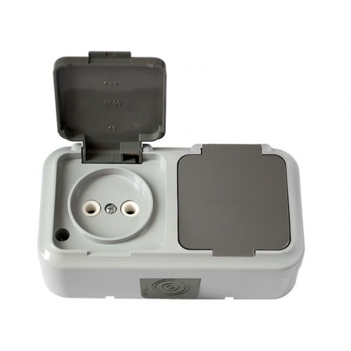Розетка 2-ая (открытая, б/з, брызг. защ.) серая, Пралеска Аква, Bylectrica