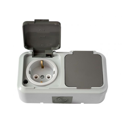Розетка 2-ая (открытая, с/з, брызг. защ.) серая, Пралеска Аква, Bylectrica