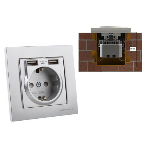 Розетка 1-ая (скрытая, с/з) + 2 USB серебро, RITA, MUTLUSAN