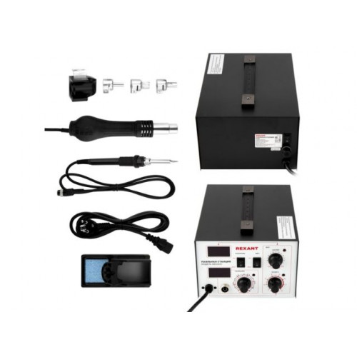 В комплектацию станции входят: основной блок, термофен, паяльник, держатель паяльника, держатель термофена, губка для очистки жала паяльника (в ложементе),а также 3 насадки для термофена разного размера.