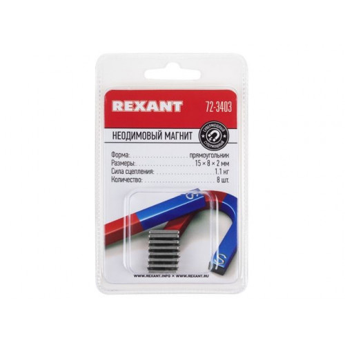 Магнит неодимовый прямоугольник 15х8х2мм сцепление 1,1 кг (упаковка 8 шт) Rexant