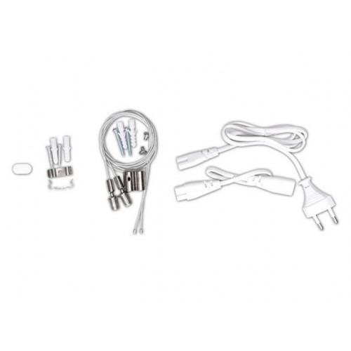 В комплекте: тросы для подвеса (длина 1 м), сетевой шнур с вилкой (длина 1 м), соединительный кабель (длина 25 см), крепежные клипсы, винты, заглушка.