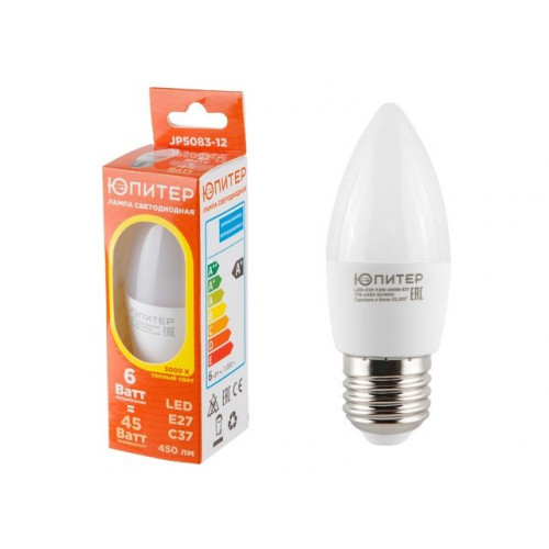 Лампа светодиодная C37 СВЕЧА 6 Вт 170-240В E27 3000К ЮПИТЕР