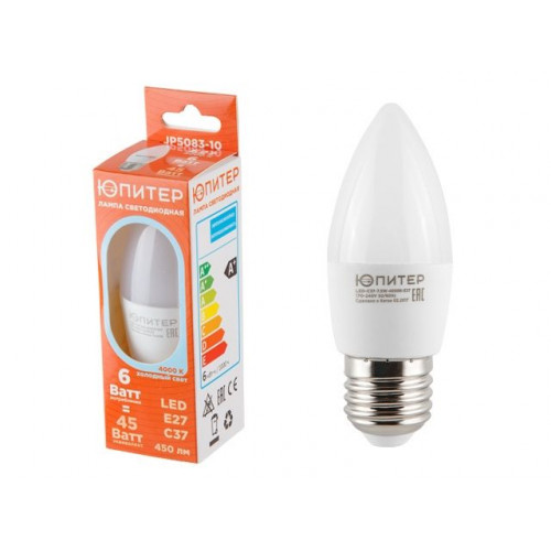 Лампа светодиодная C37 СВЕЧА 6 Вт 170-240В E27 4000К ЮПИТЕР