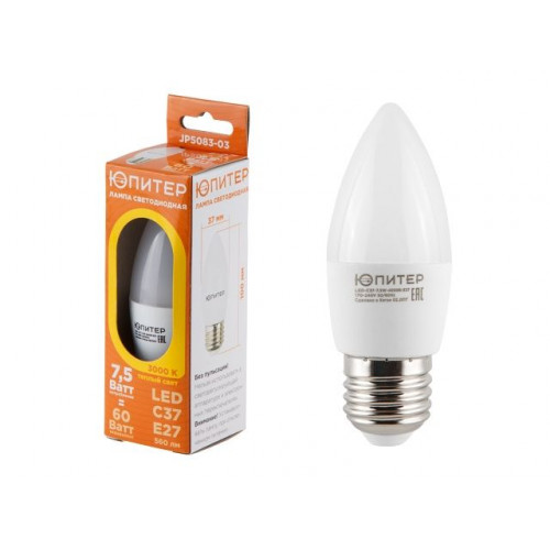 Лампа светодиодная C37 СВЕЧА 7,5 Вт 170-240В E27 3000К ЮПИТЕР