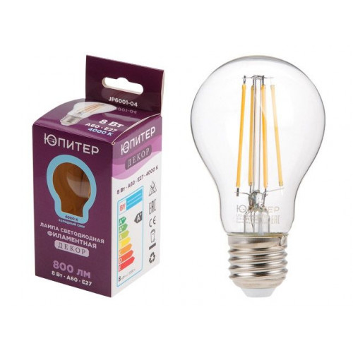 Лампа светодиодная филаментная A60 СТАНДАРТ 8 Вт E27 4000К ЮПИТЕР ДЕКОР