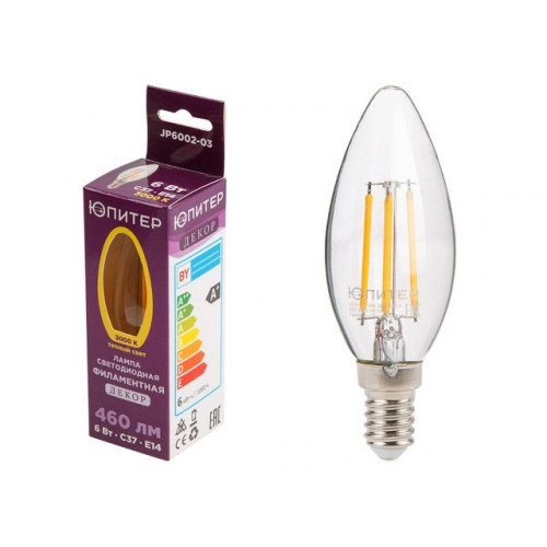Лампа светодиодная филаментная C37 СВЕЧА 6 Вт E14 3000К ЮПИТЕР ДЕКОР