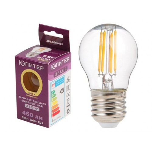 Лампа светодиодная филаментная G45 ШАР 6 Вт E27 3000К ЮПИТЕР ДЕКОР