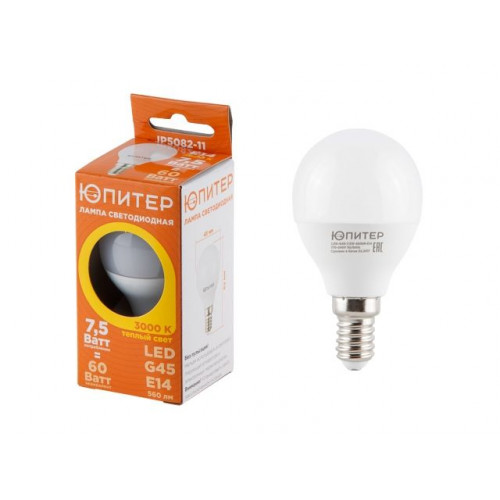 Лампа светодиодная G45 ШАР 7,5 Вт 170-240В E14 3000К ЮПИТЕР