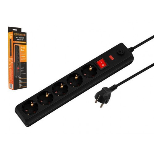 Фильтр сетевой 3м (5 роз., 2,2кВт, с/з, выкл, ПВС 3х0,75) черный Юпитер