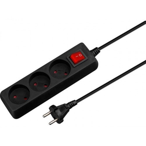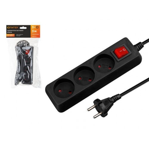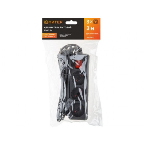 Удлинитель 3м (3 роз., 2,2кВт, б/з, выкл, ПВС 2х0,75) черный, Юпитер