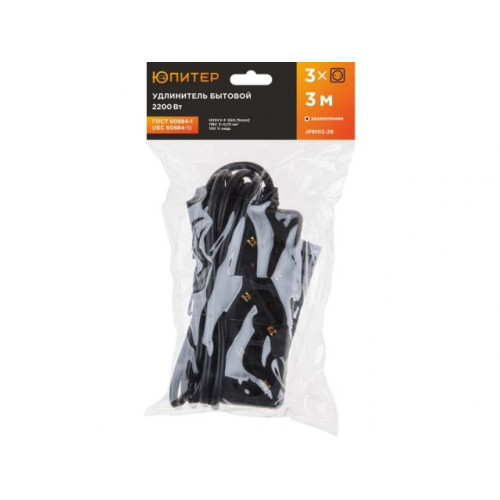 Удлинитель 3м (3 роз., 2,2кВт, с/з, ПВС 3х0,75) черный, Юпитер