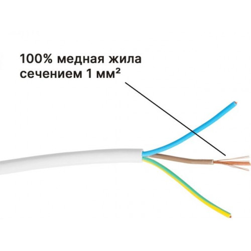 Реальное сечение провода из чистой меди гарантирует работоспособность удлинителя при подключении нагрузки до 2200Вт.