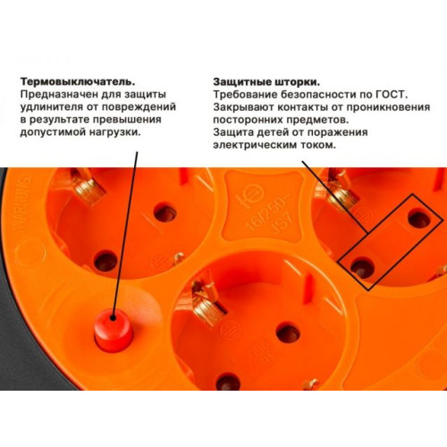 Корпус изготовлен из огнестойкого пластика, оснащен удобной рукояткой для транспортировки. На катушке есть термовыключатель, который защитит удлинитель от повреждений в результате превышения допустимой нагрузки.