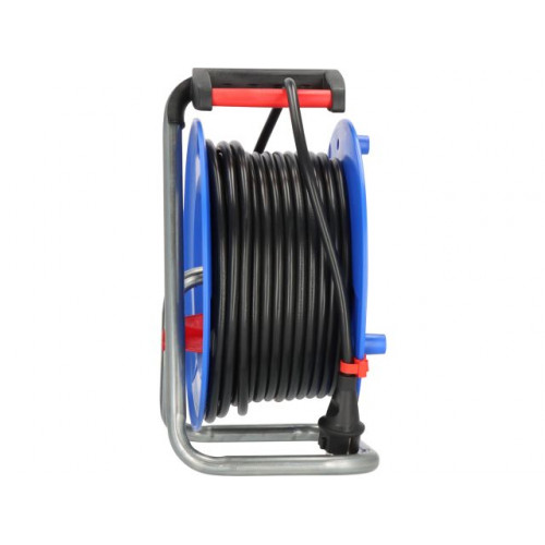 Катушка из специального пластика на оцинкованной раме. Защита от перегрева. Индикатор показывает перегрев или перегрузку. Эргономичная рукоятка и специальная ось для аккуратной намотки кабеля.