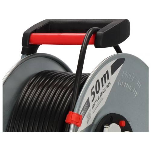 Катушка из нержавеющей оцинкованной стали на особо прочной раме. Защита от перегрева. Индикатор показывает перегрев или перегрузку. Эргономичная рукоятка и специальная ось для аккуратной намотки кабеля.
