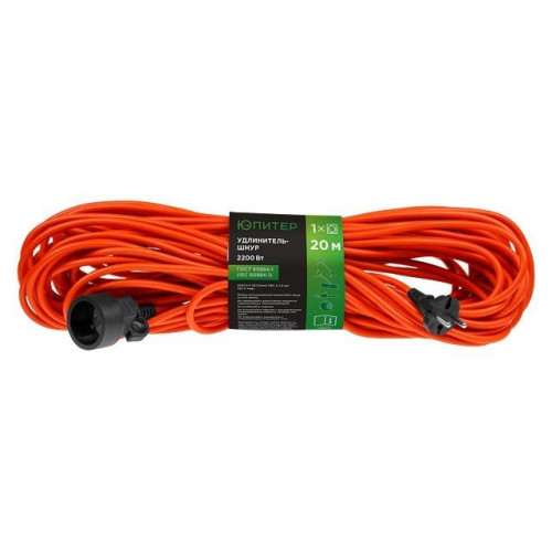 Удлинитель-шнур 20м (1 роз., 2,2кВт, б/з, ПВС 2х1) Юпитер