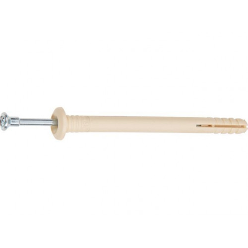 Особенности: для установки необходимо предварительно просверлить отверстие. Прочность крепежа достигается расклиниванием дюбеля в отверстии гвоздем в момент удара молотком. С помощью крестообразного шлица на головке гвоздя можно легко ослабить или усилить крепеж, демонтировать его. Дюбель-гвоздь с потайным бортиком устанавливается заподлицо, т.е. его шляпка утапливается, благодаря чему возможно производить крепежные работы без последующего выравнивания поверхности.