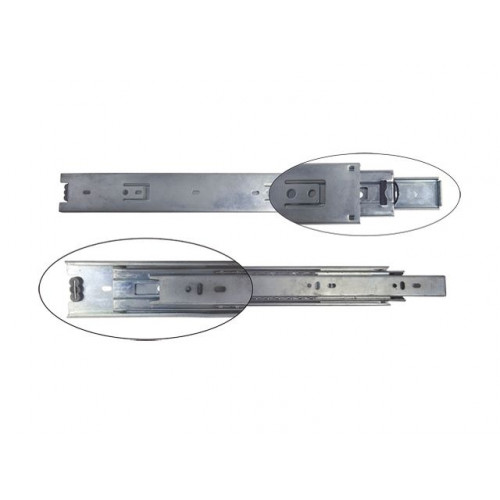 Для установки необходимо разобрать направляющую, отстегнув половину закрепляемую на выдвижном элементе (при помощи специальной защелки), после установки в изделии обе половинки направляющей необходимо совместить друг с другом и задвинуть ящик пока не раздастся щелчок. Выдвижение происходит за счет нескольких рядов шариков, удерживаемых клетках, перемежающихся в специальных пазах.