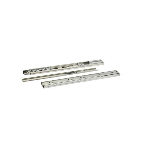 Эти направляющие имеют толщину стали 1.5 мм и рассчитаны на нагрузку 35 кг. Их телескопический механизм обеспечивает полный доступ к пространству ящика а их ход мягкий и бесшумный. Система фиксации доводчика работает бесперебойно и имеет двойную защиту от случайного соскакивания.